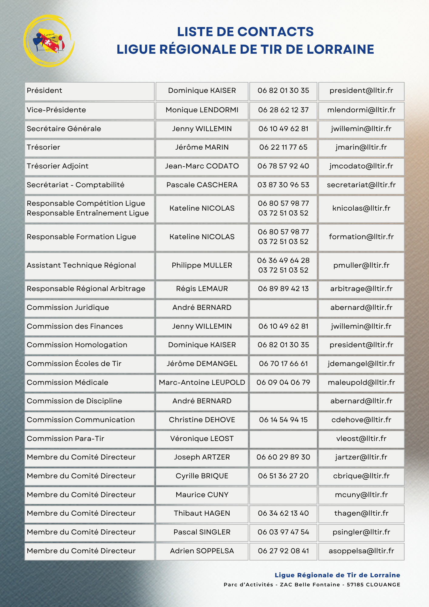 Pour simplifier la communication entre les clubs lorrains et les divers acteurs de la Ligue Régionale (élus et salariés), nous avons créé des adresses emails, à la fois nominatives et génériques.