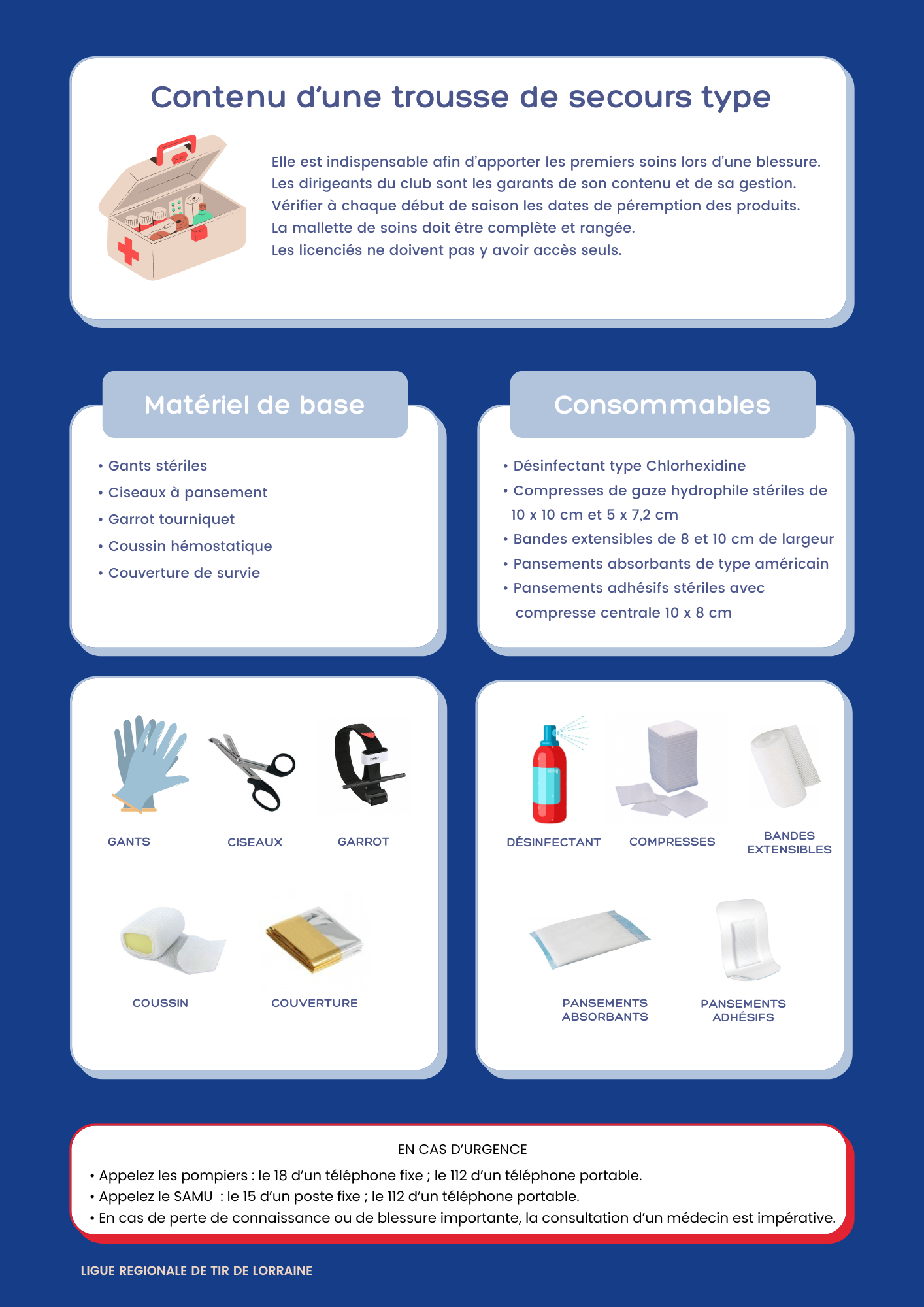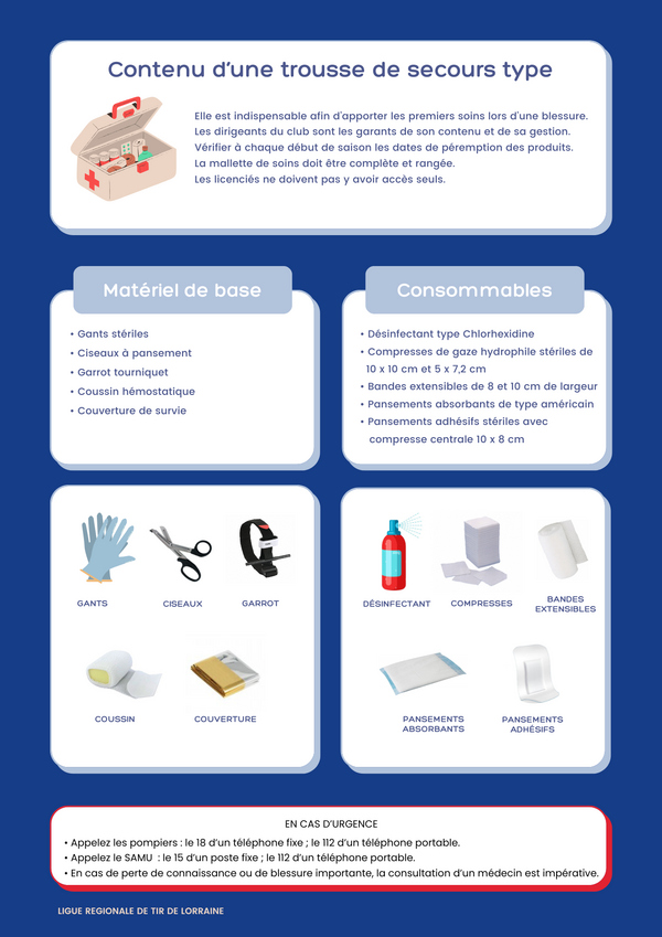 Enfin, il est fortement conseillé d’insérer dans la trousse de secours un récapitulatif des principaux numéros d’urgence (samu, pompiers, centre antipoison, etc.).
